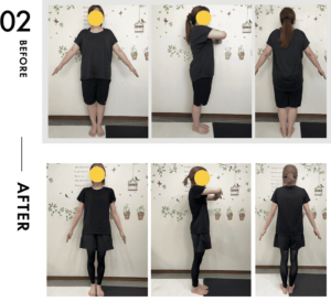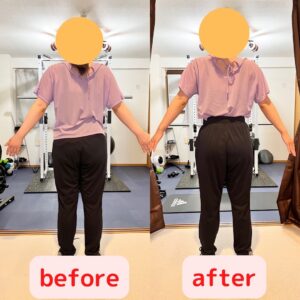 - 日常生活での意識改善: 普段の座り方や立ち方についてもアドバイスし、トレーニング以外の時間も無意識に良い姿勢を保てるようサポートしました。