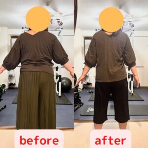 トレーニング後の骨盤矯正やケアも、身体の定着を助ける上で非常に効果的でした。結果として体重-4kg、体脂肪-5%だけでなく、横から見たときの身体のラインが劇的に改善しご本人も諦めていたパンツが履けるようになったと聞いて私も大変嬉しく思います。